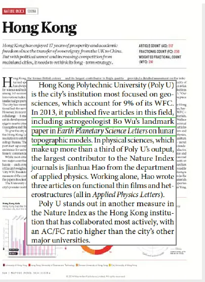 In a recent article (Nature 516, S64–S65) about “NATURE INDEX: 2014 CHINA – Hong Kong” published by Nature on 18 December 2014, LSGI Scholar Dr. Bo Wu’s research work about lunar mapping was highlighted as “Hong Kong Polytechnic University (Poly U) is the city’s institution most focused on geosciences, which account for 9% of its WFC. In 2013, it published five articles in this field, including astrogeologist Bo Wu’s landmark paper in Earth Planetary Science Letters on lunar topographic models”.