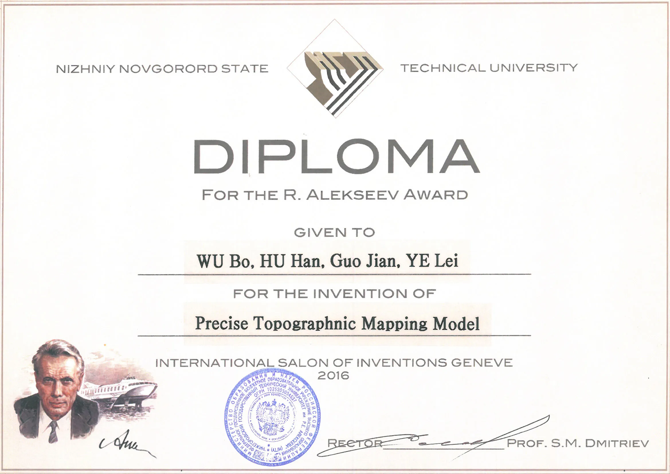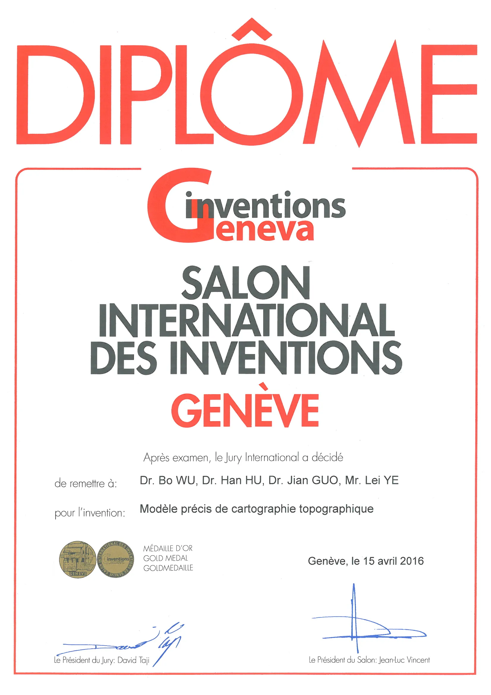 2016年4月13日至17日,日内瓦国际发明展在瑞士举办,小组成员吴波和胡翰的参展项目”Precise Topographic Mapping Model”荣获该展会特别优异奖(Special Merit Award)与金奖(Golden Medal)两项大奖。