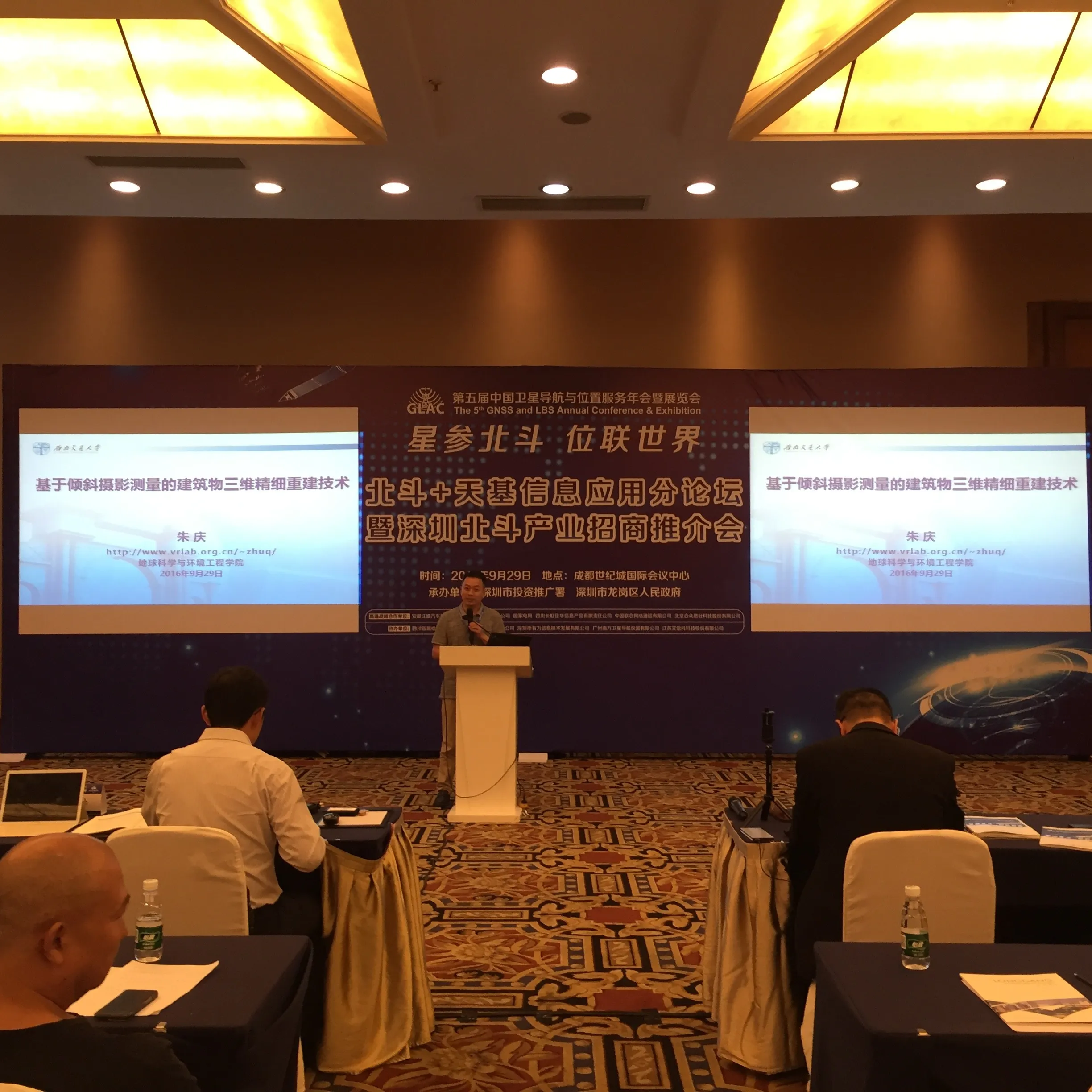 同日下午朱庆教授主持了第五届中国卫星导航定位协会年会的“北斗+天基信息应用”分论坛并做了题为“基于倾斜摄影测量的建筑物三维精细重建技术”的学术报告。