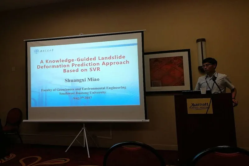 2017年8月2日至4日,第25届国际地理信息科学会议(The 25th International Conference on Geoinformatics)在美国布法罗顺利召开,小组博士生苗双喜和李维炼,硕士生刘畅、张琳琳和李妍羲参加了本次会议,博士生苗双喜在会上作了题为“A Knowledge-guided Landslide Deformation Prediction Approach Based on SVR”的口头报告。