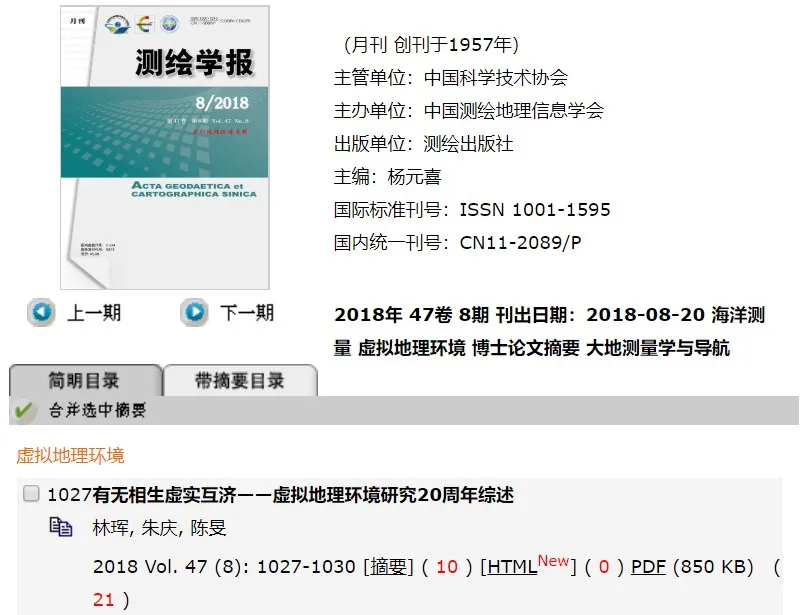 《测绘学报》16年之后再次发表虚拟地理环境专辑系列文章