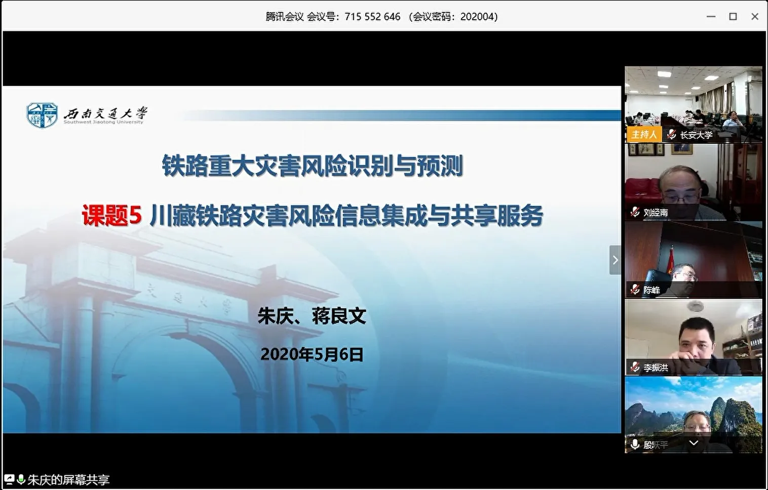 2020年5月6日下午,由长安大学牵头的国家自然科学基金《重大铁路重大基础科学问题专项》项目四“重大铁路重大灾害风险识别与预测”启动会以视频会议形式成功举办,参会专家有华中科技大学丁烈云院士、武汉大学刘经南院士、中国科学院崔鹏院士、长安大学彭建兵院士、中国国家铁路集团有限公司科信部赵国堂主任、自然资源部地质灾害技术指导中心殷跃平总工、中国地质大学(武汉)唐辉明副书记、长安大学张勤教授、重大铁路四川有限公司张利国副总经理、中国自然资源航空物探遥感中心葛大庆主任、国家自然基金委副主任侯增谦院士、基金委地学部姚玉鹏副主任、张朝林处长、刘羽处长,长安大学党委书记陈峰教授等领导出席并致辞。
