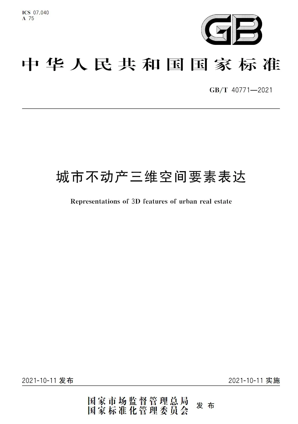 2021年10月11日,团队参研的国家标准 城市不动产三维空间要素表达(GB/T 40771-2021)正式发布实施。该标准以不动产单元(产权体)为基础,对城市不动产三维空间要素的空间和属性信息进行了统一、规范化表达,旨在支撑三维不动产管理。