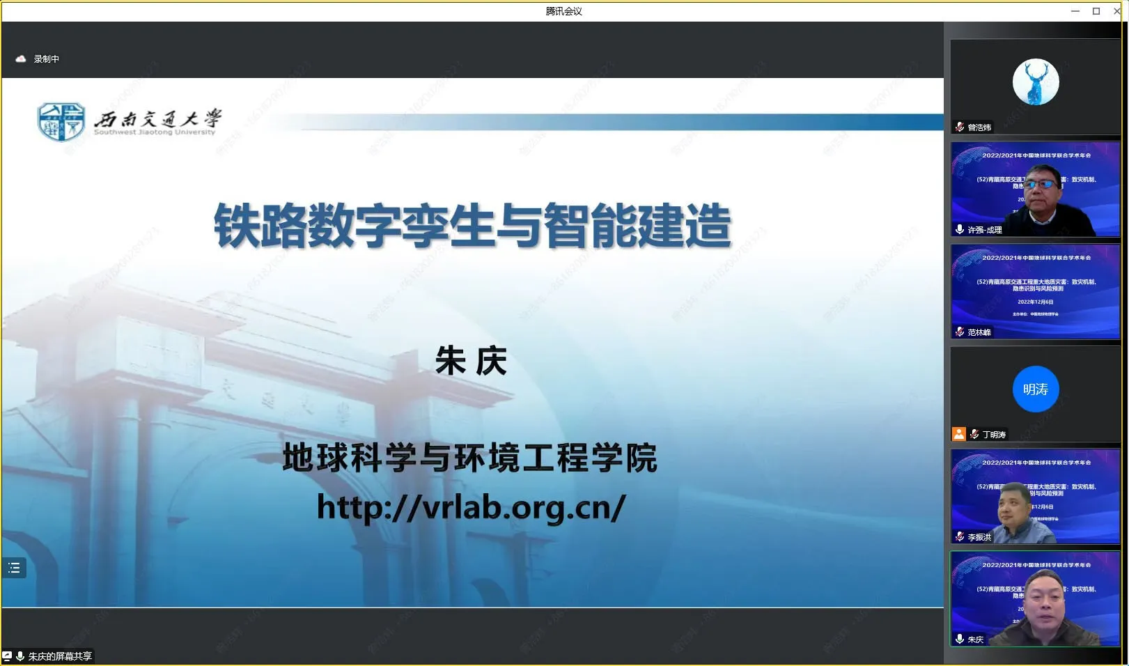 2022年12月6日,中国地球科学联合学术年会采用线上会议方式成功举行,朱庆教授做了“铁路数字孪生与智能建造”特邀报告,曾浩炜博士做了“环境相似性约束的滑坡易发性图神经网络可靠评估方法”唯一一个学生报告。