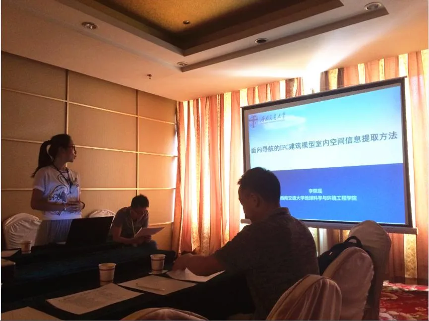 我院2014级硕士研究生李佩瑶做了”面向导航的IFC模型室内空间信息提取方法”的报告,同学们认真听取了会场报告,并积极交流发言。通过参加本次年会增强了同学们对GIS专业学习的信心,有助于开拓学术视野、把握学术前沿,为未来的学习生活提供重大的指引。