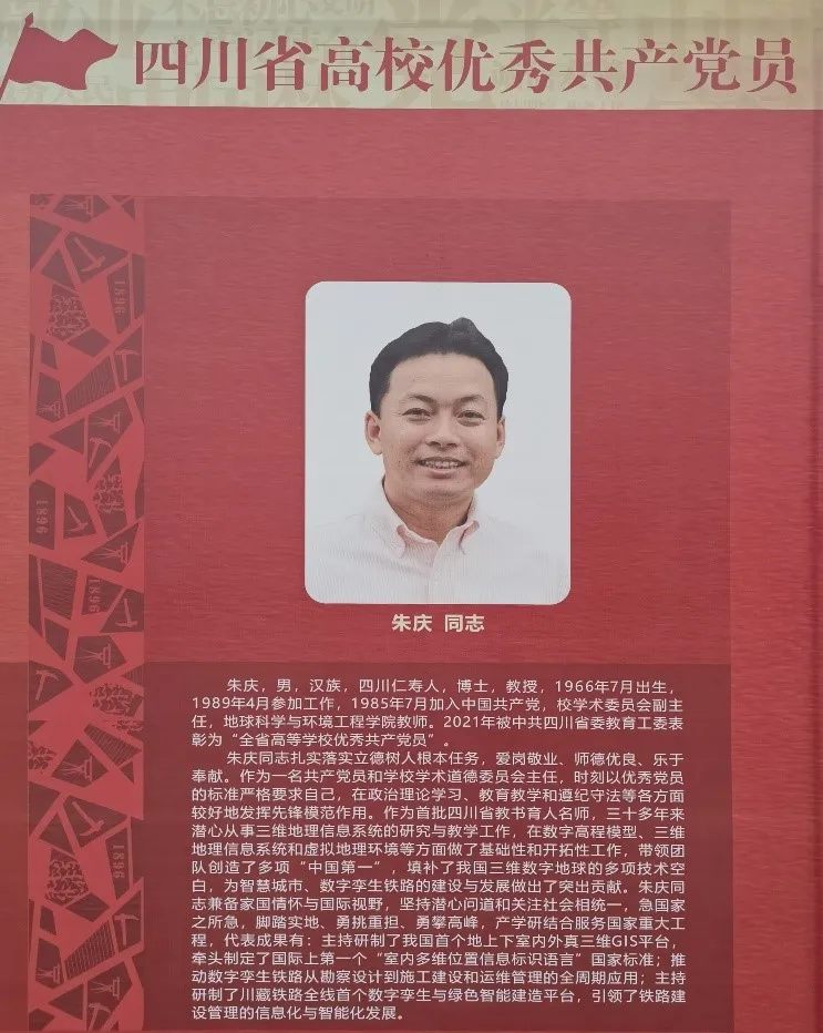 2021年6月29日,传承红色基因,接续百年奋斗,中共西南交通大学委员会“两优一先”表彰大会暨“光荣在党50年”纪念章颁发仪式隆重举行,集中表彰一批优秀共产党员、优秀党务工作者和先进基层党组织,庆祝建党100周年,激发全校共产党员和广大师生员工干事创业的强大精神力量。朱庆教授被中共四川省委教育工委表彰为“全省高等学校优秀共产党员”,丁雨淋副教授荣获“西南交通大学2019-2021年度优秀共产党员”称号。