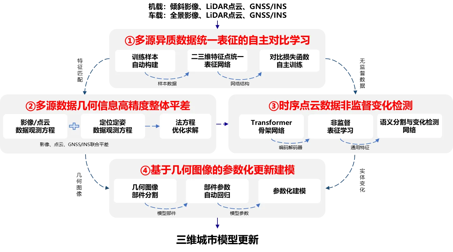本项目面向实景三维中国和新型智慧城市建设等国家战略对精细三维城市模型更新的迫切需求,拟突破多源数据几何与辐射属性异质导致的统一表征难、复杂城市实体要素变化检测依赖海量人工标注、结构化精细三维模型更新建模自动化程度低等关键技术瓶颈,从而支撑精细化的三维城市模型自动更新。