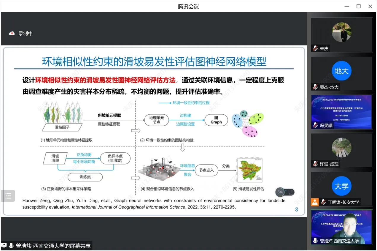 2022年12月6日,中国地球科学联合学术年会采用线上会议方式成功举行,朱庆教授做了“铁路数字孪生与智能建造”特邀报告,曾浩炜博士做了“环境相似性约束的滑坡易发性图神经网络可靠评估方法”唯一一个学生报告。